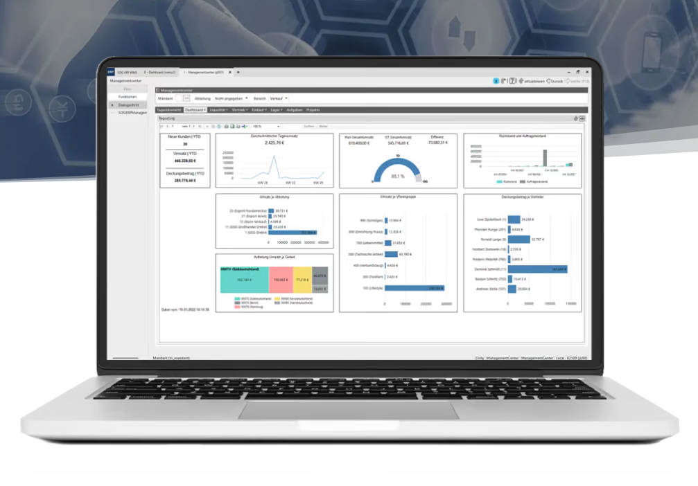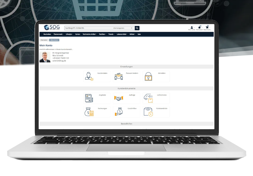E-Commerce-Lösung mit Echtzeitdaten - Mit dem SOG Online-Shop (B2B & B2C) und Kundenportal nutzen Sie einen neuen Vertriebs- und Kundenbindungskanal. Die Pflege der Stammdaten und des Online-Shop-Menüs erfolgt direkt im SOG ERP. Über Datenbankabfragen in Echtzeit sehen Ihre Kunden immer aktuellste Vorgänge, Bestände, Lieferrückstände sowie Sendungsverfolgungsdaten.
